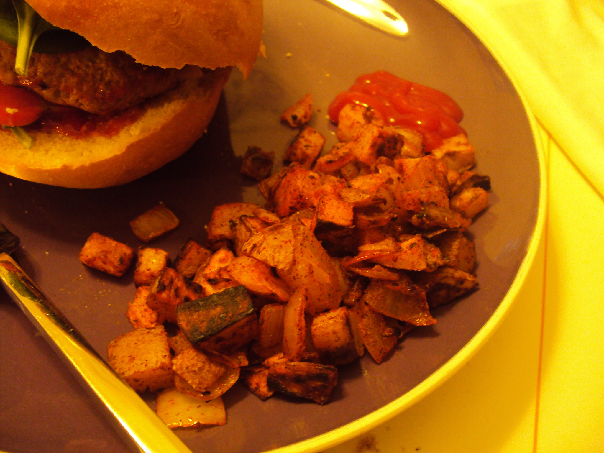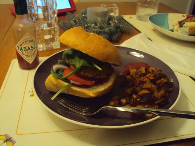 Mr. Turkey Burger pictured with homemade homefries and Tabasco, the best condiment EVER