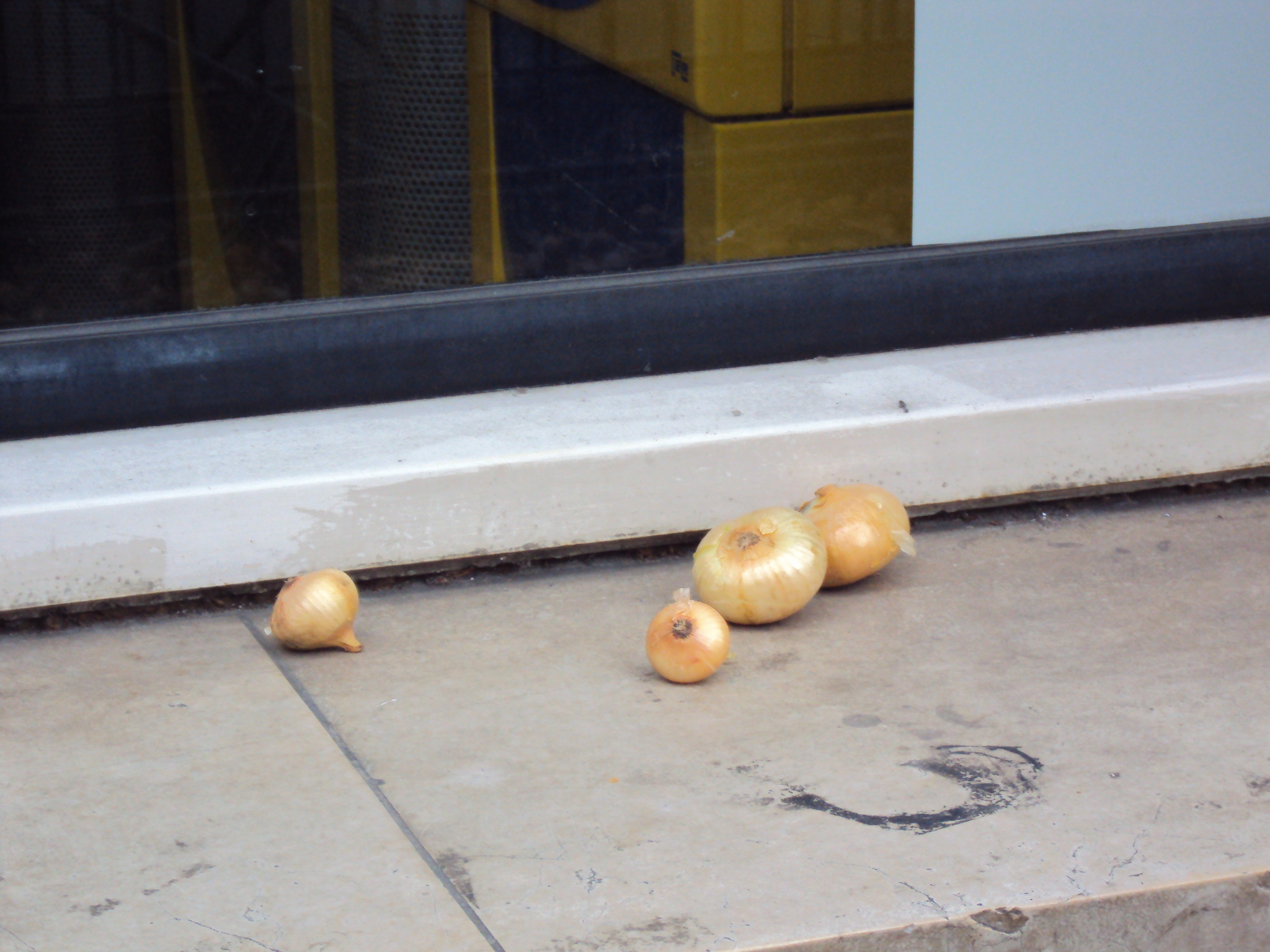 Um, those were onions littered on a windowsill outside a BANK. I just about died when I saw them and I wonder what the story was behind them.