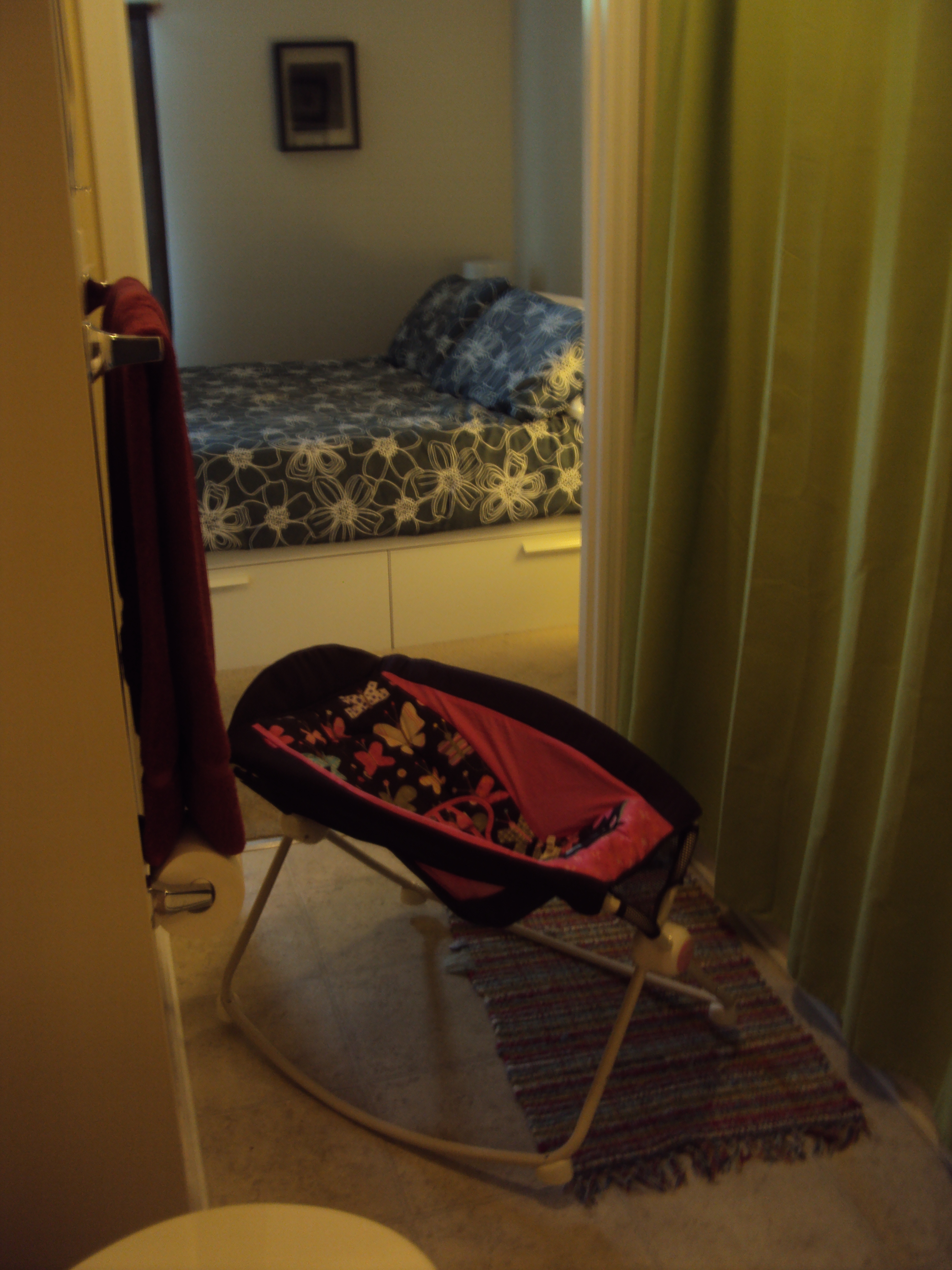 You have the same swing as us! We had to get rid of that thing–V wouldn’t settle down in it at all. the only thing she would settle for was the Bjorn carrier, in which she spent a year. Co-sleeping can be done safely. My parents had a very inexpensive co-sleeping product that kept the baby (each time) contained between two bumpers (in the middle of a massive king-size bed) so she had tons of space and no oxygen deprivation. The hardest thing about co-sleeping is getting the baby out of the bed when the time comes (about five months for each of them in our case). Definitely lots of pros and cons to the whole business.