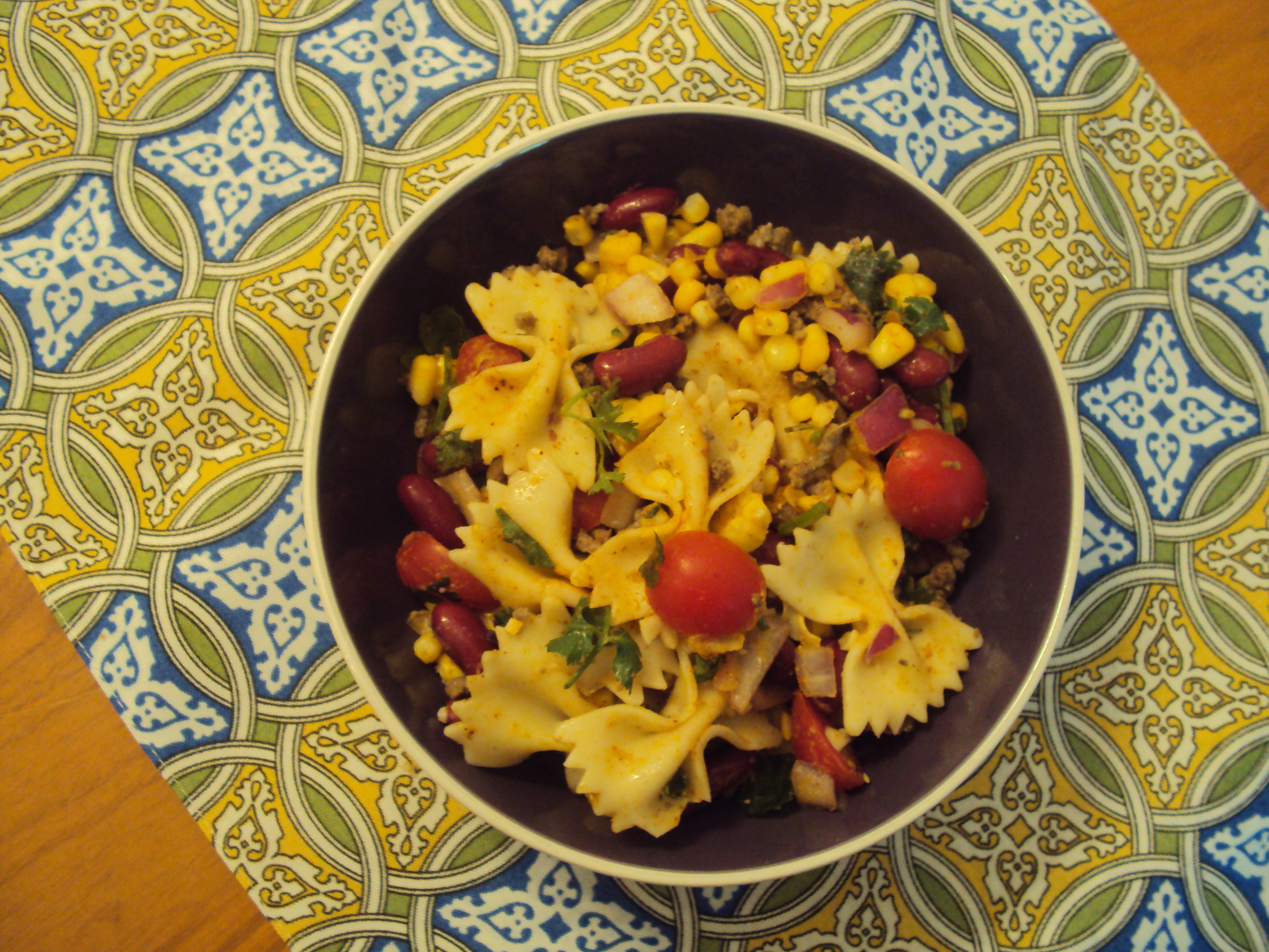 So, moving on. My mother in law Sidney made this “chili” pasta salad for us last summer and we were immediately hooked. It takes some of the best things about chili and makes them fit for consumption during the hottest days of summer. It’s delicious and easy to make when you want something filling but don’t want to be in the kitchen all day. It’s a crowd-pleaser and makes a great addition to any potluck.