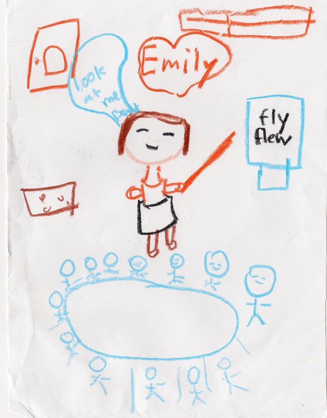 Of all the things my student Leewon (age six) could have put in my conversation bubble, she chose “Look at me, please.” Wow, way to make me look dictatorial. Perhaps if they don’t give me 100% of their attention, I will slap them with my wooden baton. Those four kids who aren’t looking at me have it coming. Hell hath no fury.