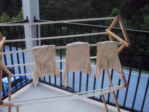 I miss my times in the restaurant, but all I have to do now to relive them is look out on the porch at C’s diapers drying on the rack. Ever since B mentioned that they kind of look like chickens roasting on a rotisserie, that’s all I can see.