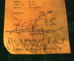 Luckily (very, very luckily), that receipt is not an artifact from my own days as a server; I just found it on Google images. I think it made headlines a few years ago. The worst tip I personally ever got was a $1.50 on a $75 bill. Oh, and it was in Canadian currency.